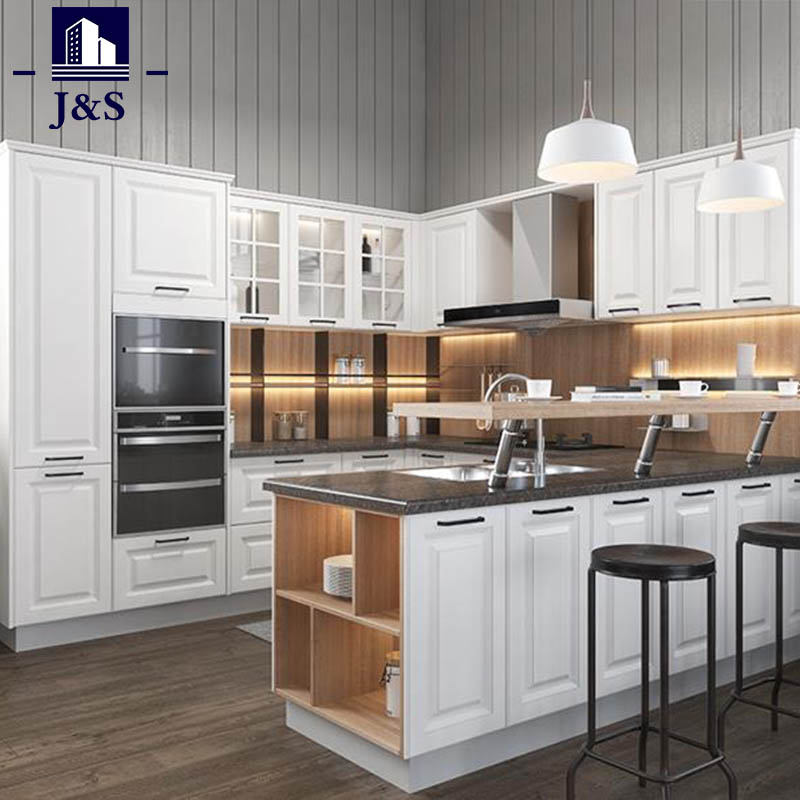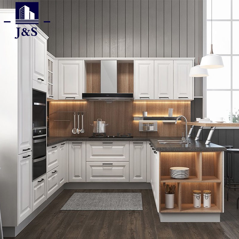 J&S సప్లై కస్టమ్ వైట్ PVC కిచెన్ క్యాబినెట్, ఇది U ఆకారపు లేఅవుట్ కిచెన్ క్యాబినెట్, ప్రొఫైల్తో PVC చుట్టబడిన వైట్ డోర్ ప్యానెల్, ప్రీమియం క్వాలిటీ బ్లమ్ సాఫ్ట్-క్లోజింగ్ హింగ్లు. పెద్ద టెన్డం బాక్స్ మీకు మరిన్ని డైనింగ్ వేర్లను నిల్వ చేయడానికి అనుమతిస్తాయి.