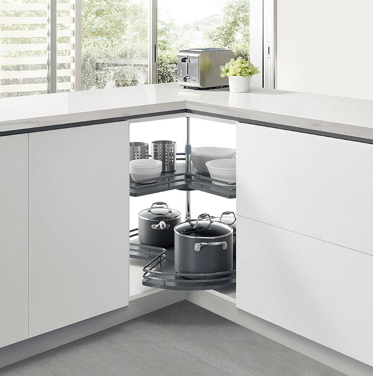 స్టోరేజ్ కిచెన్ సొల్యూషన్ మ్యాజిక్ కార్నర్ క్యాబినెట్లు ఉపయోగ పద్ధతి ప్రకారం రెండు రకాలుగా విభజించబడ్డాయి: ఒకటి పుల్ అవుట్ రకం. ఈ మూలలో పుల్-అవుట్ బుట్టను డోర్ ప్యానెల్తో కలిసి బయటకు తీయవచ్చు, ఇది స్థలాన్ని గరిష్టంగా ఉపయోగించగలదు మరియు సౌకర్యవంతంగా మరియు ఆచరణాత్మకంగా ఉంటుంది. ప్రతికూలత ఏమిటంటే సంస్థాపన సమస్యాత్మకమైనది మరియు అధిక ధర. మరొకటి టర్న్ టేబుల్ రకం. టర్న్ టేబుల్ కార్నర్ బాస్కెట్ ధర పుల్ అవుట్ కార్నర్ బాస్కెట్ కంటే చాలా చౌకగా ఉంటుంది మరియు నిర్మాణం చాలా సులభం. ప్రతికూలత ఏమిటంటే, ఖాళీ వినియోగ రేటు తక్కువగా ఉంటుంది, ఇది వ్యర్థాలను కలిగించడం సులభం.